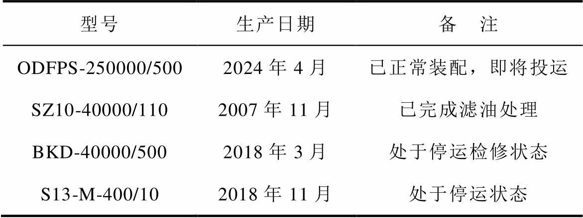 型号生产日期备 注 ODFPS-250000/5002024年4月已正常装配,即将投运 SZ10-40000/1102007年11月已完成滤油处理 BKD-40000/5002018年3月处于停运检修状态 S13-M-400/102018年11月处于停运状态
