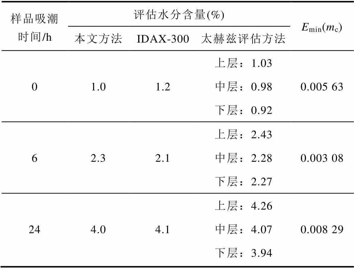 样品吸潮时间/h评估水分含量(%)Emin(mc) 本文方法IDAX-300太赫兹评估方法 01.01.2上层:1.030.005 63 中层:0.98 下层:0.92 62.32.1上层:2.430.003 08 中层:2.28 下层:2.27 244.04.1上层:4.260.008 29 中层:4.07 下层:3.94
