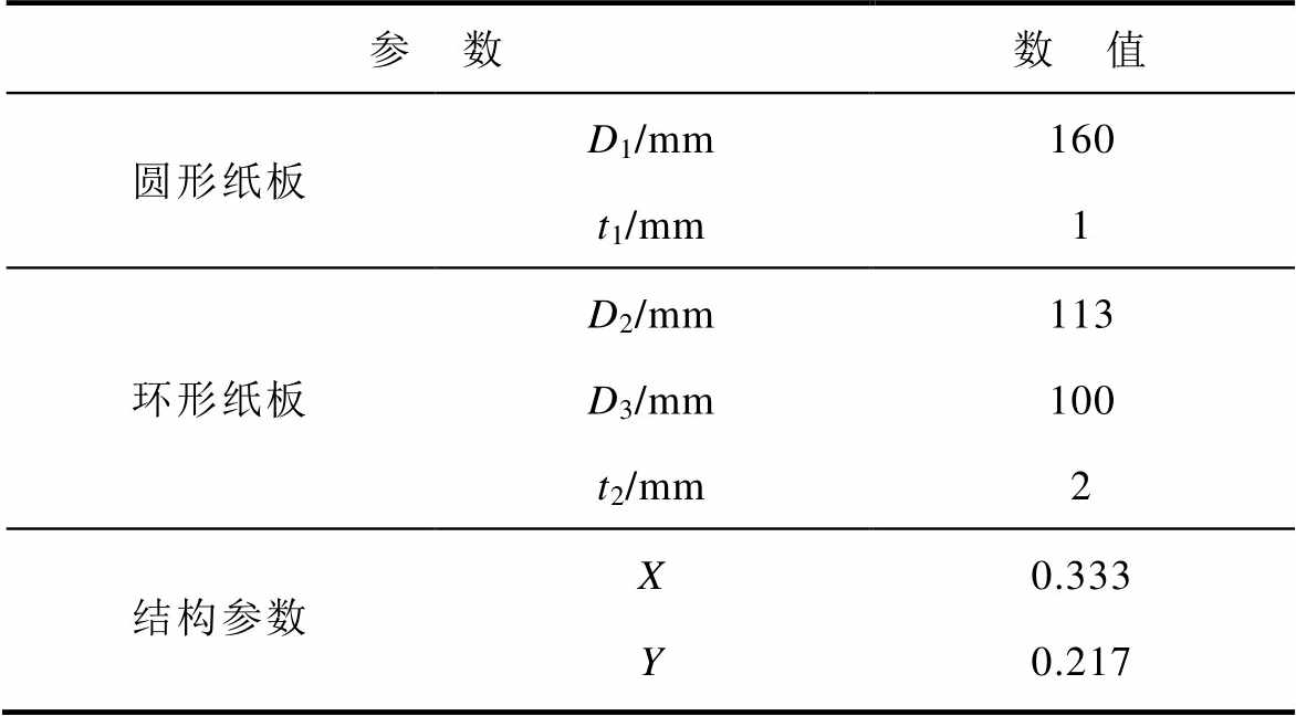 试验中,圆形纸板直径D1=160 mm,厚度t1= 1 mm,环形纸板外径D2和内径D3分别为113 mm和100 mm,厚度t2=2 mm。结构参数X和Y的计算式分别为