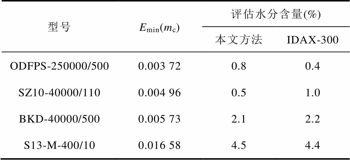 型号Emin(mc)评估水分含量(%) 本文方法IDAX-300 ODFPS-250000/5000.003 720.80.4 SZ10-40000/1100.004 960.51.0 BKD-40000/5000.005 732.12.2 S13-M-400/100.016 584.54.4