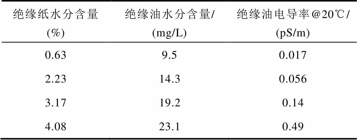 绝缘纸水分含量(%)绝缘油水分含量/(mg/L)绝缘油电导率@20℃/(pS/m) 0.639.50.017 2.2314.30.056 3.1719.20.14 4.0823.10.49