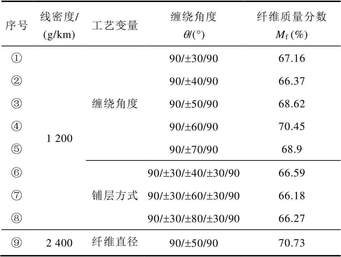 序号线密度/(g/km)工艺变量缠绕角度q/(°)纤维质量分数Mf (%) ①1 200缠绕角度90/±30/9067.16 ②90/±40/9066.37 ③90/±50/9068.62 ④90/±60/9070.45 ⑤90/±70/9068.9 ⑥铺层方式90/±30/±40/±30/9066.59 ⑦90/±30/±60/±30/9066.18 ⑧90/±30/±80/±30/9066.27 ⑨2 400纤维直径90/±50/9070.73