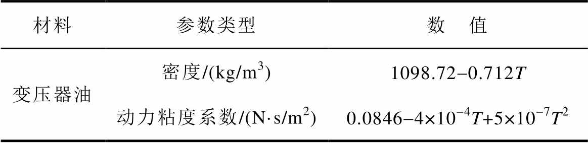 材料参数类型数 值 变压器油密度/(kg/m3)1098.72-0.712T 动力粘度系数/(N·s/m2)0.0846-4×10-4T+5×10-7T2