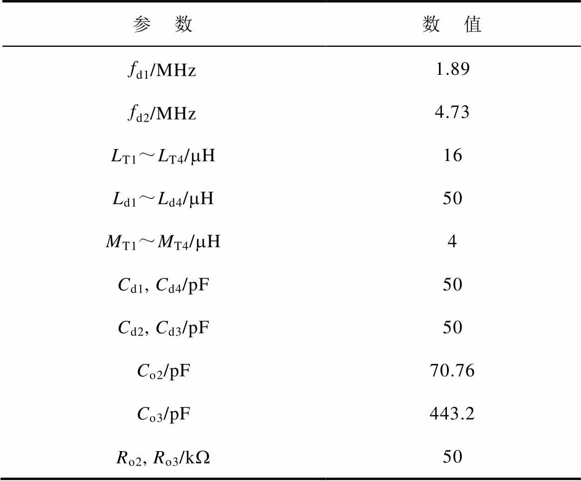 参 数数 值 fd1/MHz1.89 fd2/MHz4.73 LT1~LT4/mH16 Ld1~Ld4/mH50 MT1~MT4/mH4 Cd1, Cd4/pF50 Cd2, Cd3/pF50 Co2/pF70.76 Co3/pF443.2 Ro2, Ro3/kW50
