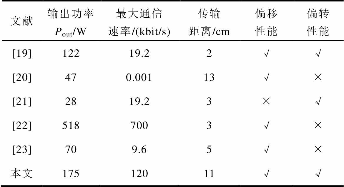 将所提WPST系统与现有文献的分离通道无线电能与信号同步传输方法进行对比,从输出功率、最大通信速率、偏移及偏转性能进行比较,对比结果见表3。通过对比可知,本文所提双解耦型信号线圈的WPST系统能够在较远的传输距离下完成较大的输出功率和通信速率,并且同时兼具偏移及偏转性能特性。