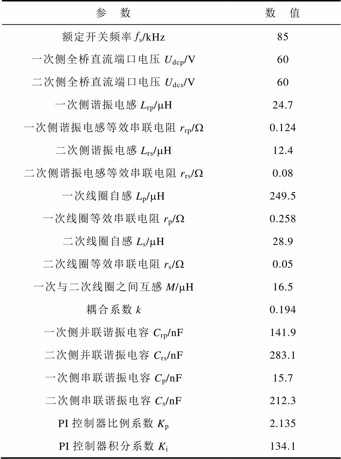 参 数数 值 额定开关频率fs/kHz85 一次侧全桥直流端口电压Udcp/V60 二次侧全桥直流端口电压Udcs/V60 一次侧谐振电感Lrp/mH24.7 一次侧谐振电感等效串联电阻rrp/W0.124 二次侧谐振电感Lrs/mH12.4 二次侧谐振电感等效串联电阻rrs/W0.08 一次线圈自感Lp/mH249.5 一次线圈等效串联电阻rp/W0.258 二次线圈自感Ls/mH28.9 二次线圈等效串联电阻rs/W0.05 一次与二次线圈之间互感M/mH16.5 耦合系数k0.194 一次侧并联谐振电容Crp/nF141.9 二次侧并联谐振电容Crs/nF283.1 一次侧串联谐振电容Cp/nF15.7 二次侧串联谐振电容Cs/nF212.3 PI控制器比例系数Kp2.135 PI控制器积分系数Ki134.1