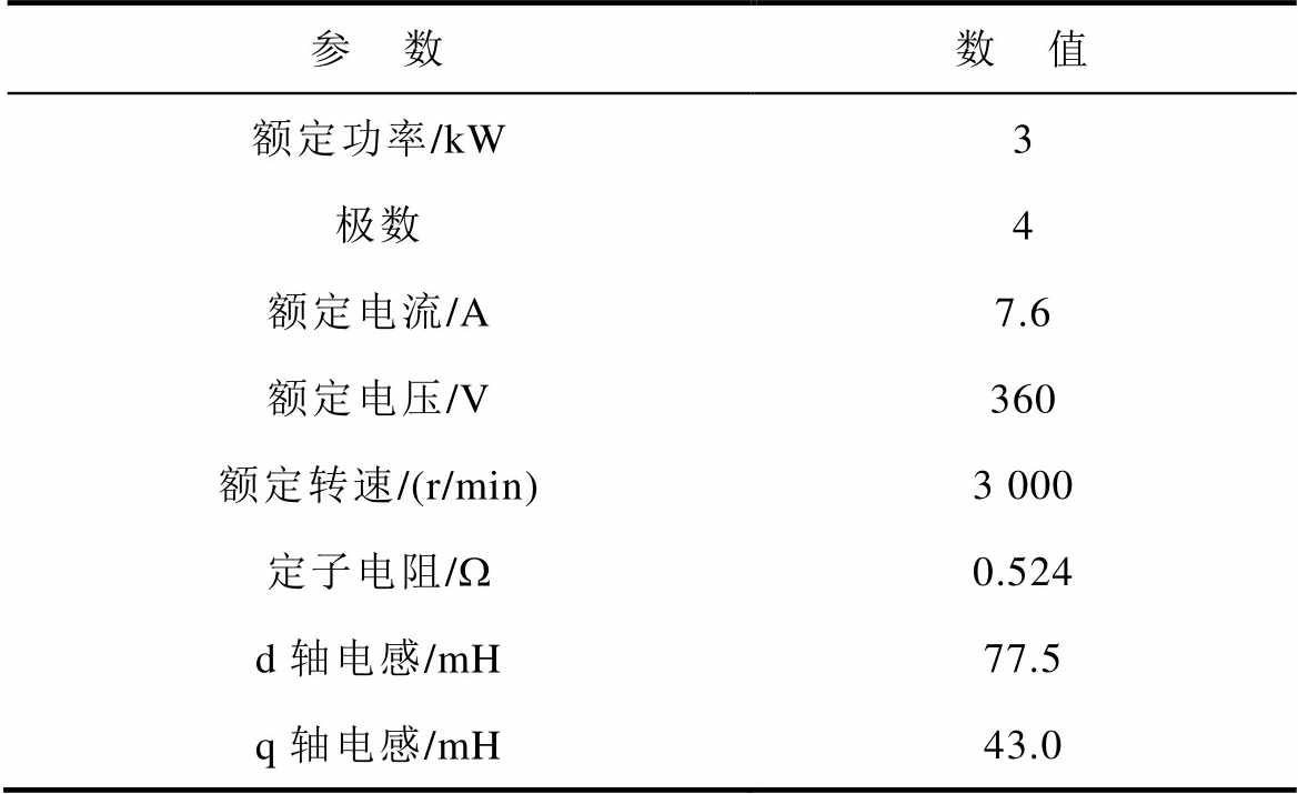 参 数数 值 额定功率/kW3 极数4 额定电流/A7.6 额定电压/V360 额定转速/(r/min)3 000 定子电阻/W0.524 d轴电感/mH77.5 q轴电感/mH43.0