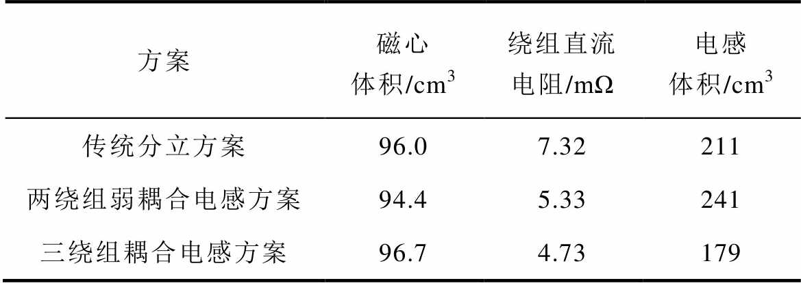 由表3可知传统分立方案、两绕组弱耦合电感方案的等效基波电感和等效环流电感与三绕组耦合电感方案近似保持相同。将三种方案在磁心体积、绕组直流电阻和电感体积三个维度进行对比,结果见表4。