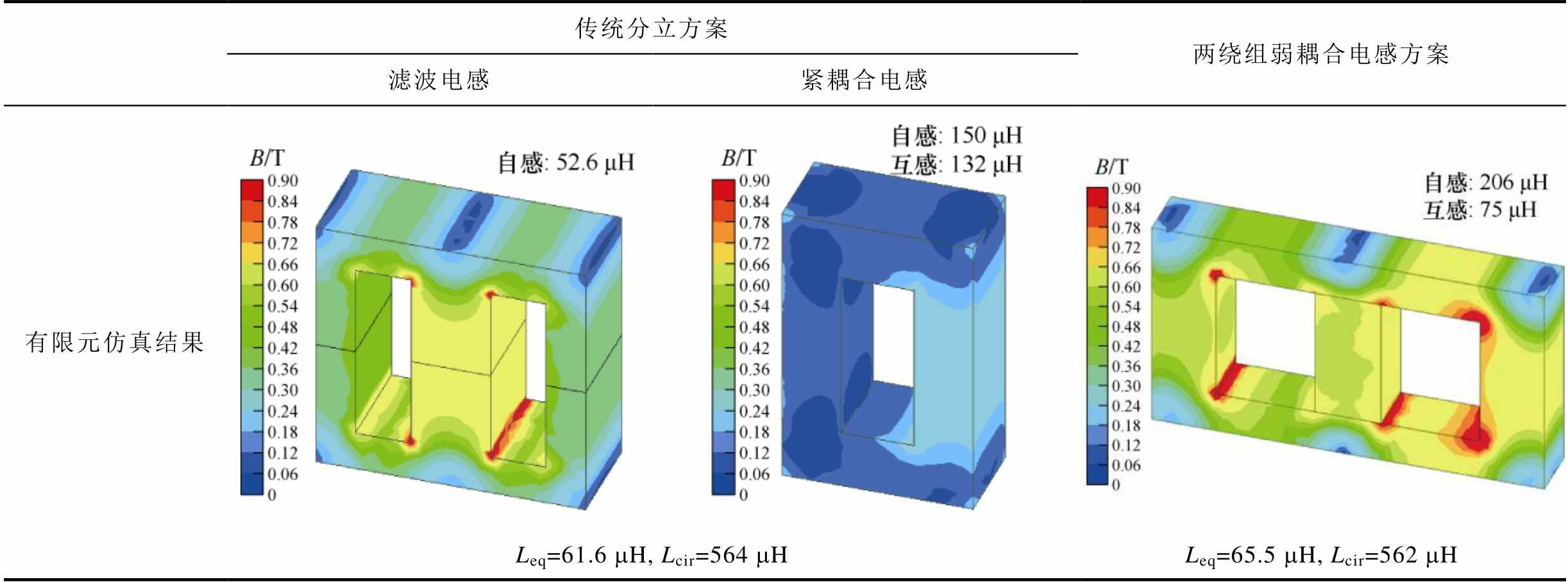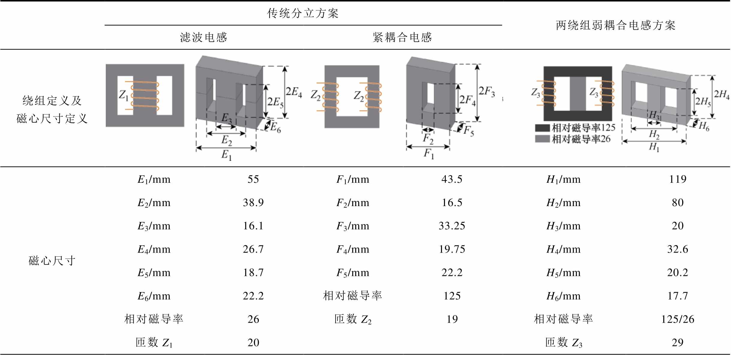 为了体现所提三绕组耦合电感的优势,需要将其与传统分立方案以及两绕组弱耦合电感方案进行对比。传统分立方案以及两绕组弱耦合电感方案的设计结果见表3。为了方案对比的公平性,设计时已保证三种方案的绕组电流密度相同(均为7 A/mm2),电路外特性和以及磁心最大平均磁通密度近似相同。