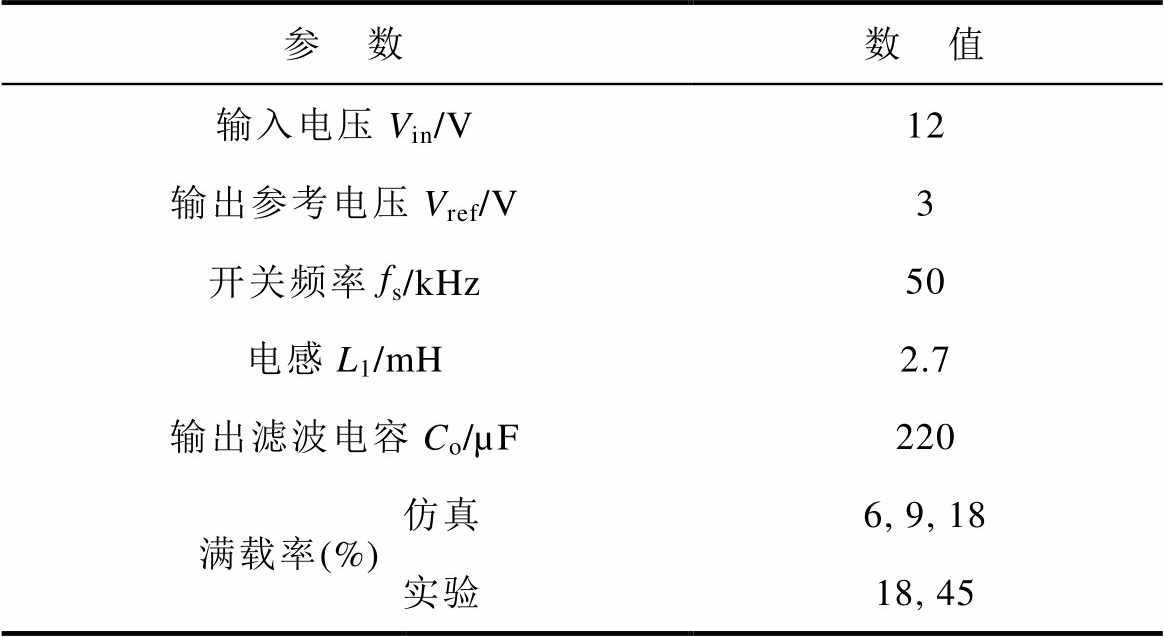 参 数数 值 输入电压Vin/V12 输出参考电压Vref/V3 开关频率fs/kHz50 电感L1/mH2.7 输出滤波电容Co/µF220 满载率(%) 仿真6, 9, 18 实验18, 45