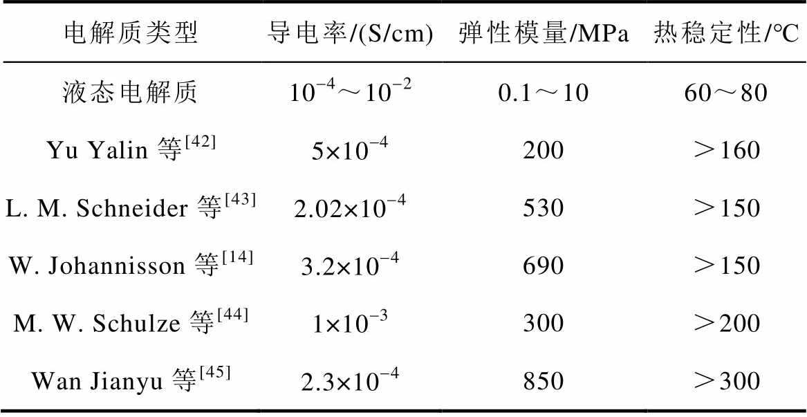 电解质类型导电率/(S/cm)弹性模量/MPa热稳定性/℃ 液态电解质10-4~10-20.1~1060~80 Yu Yalin等[42]5×10-4200>160 L. M. Schneider等[43]2.02×10-4530>150 W. Johannisson等[14]3.2×10-4690>150 M. W. Schulze等[44]1×10-3300>200 Wan Jianyu等[45]2.3×10-4850>300
