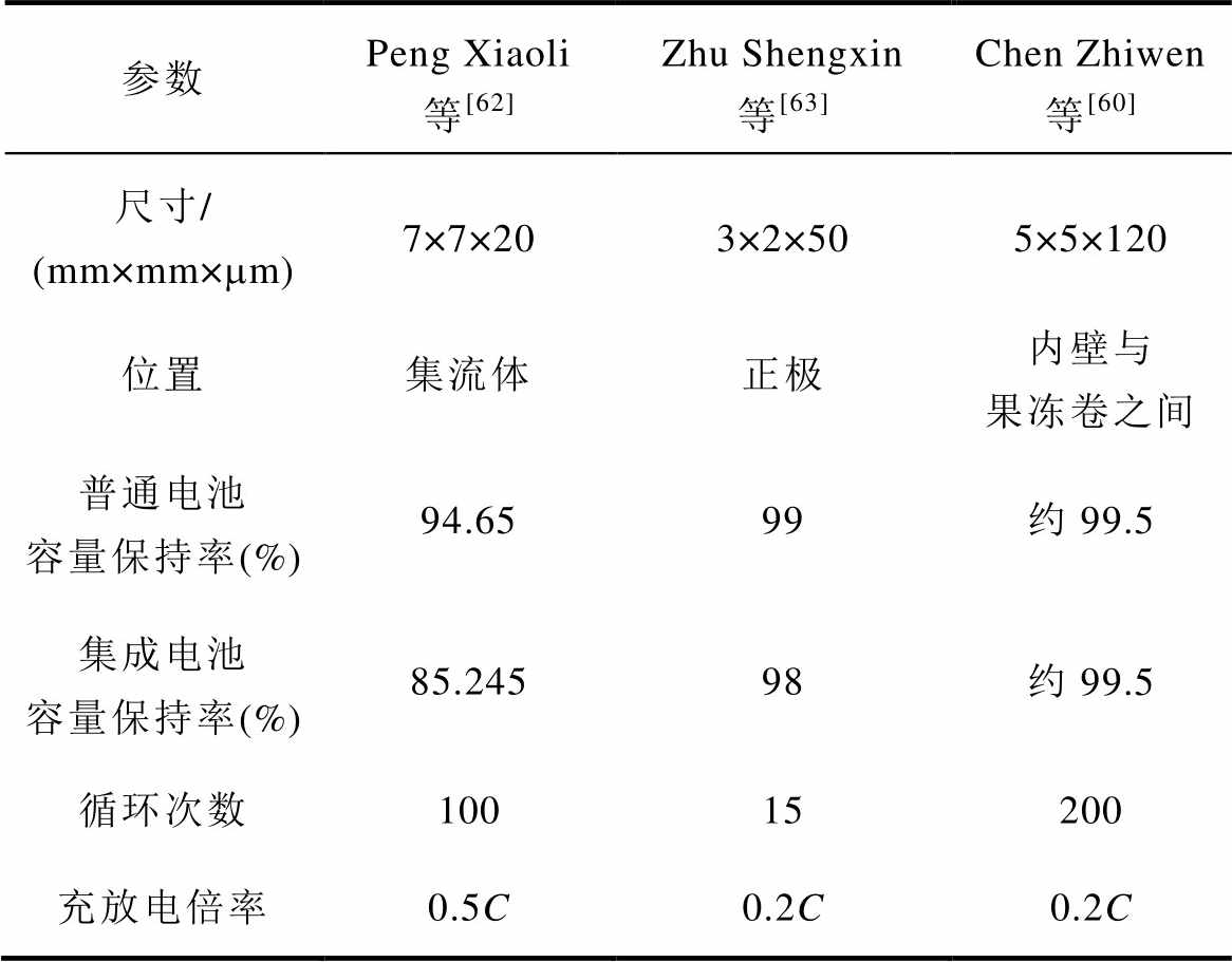 参数Peng Xiaoli等[62]Zhu Shengxin等[63]Chen Zhiwen等[60] 尺寸/ (mm×mm×mm)7×7×203×2×505×5×120 位置集流体正极内壁与果冻卷之间 普通电池容量保持率(%)94.6599约99.5 集成电池容量保持率(%)85.24598约99.5 循环次数10015200 充放电倍率0.5C0.2C0.2C