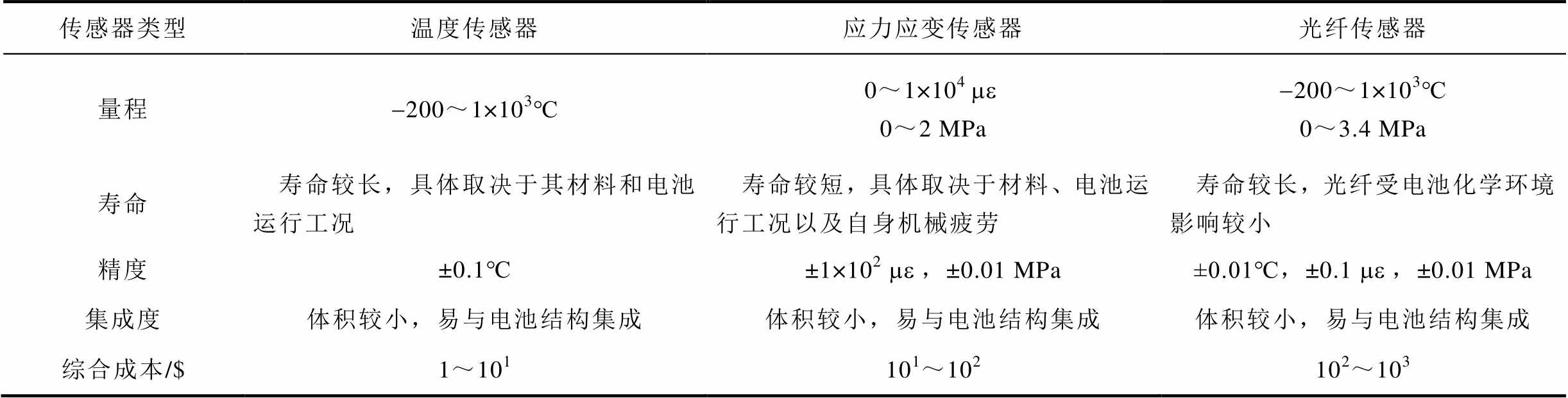 传感器类型温度传感器应力应变传感器光纤传感器 量程-200~1×103℃0~1×104 me0~2 MPa-200~1×103℃ 0~3.4 MPa 寿命寿命较长,具体取决于其材料和电池运行工况寿命较短,具体取决于材料、电池运行工况以及自身机械疲劳寿命较长,光纤受电池化学环境影响较小 精度±0.1℃±1×102 me,±0.01 MPa±0.01℃,±0.1 me,±0.01 MPa 集成度体积较小,易与电池结构集成体积较小,易与电池结构集成体积较小,易与电池结构集成 综合成本/$1~101101~102102~103