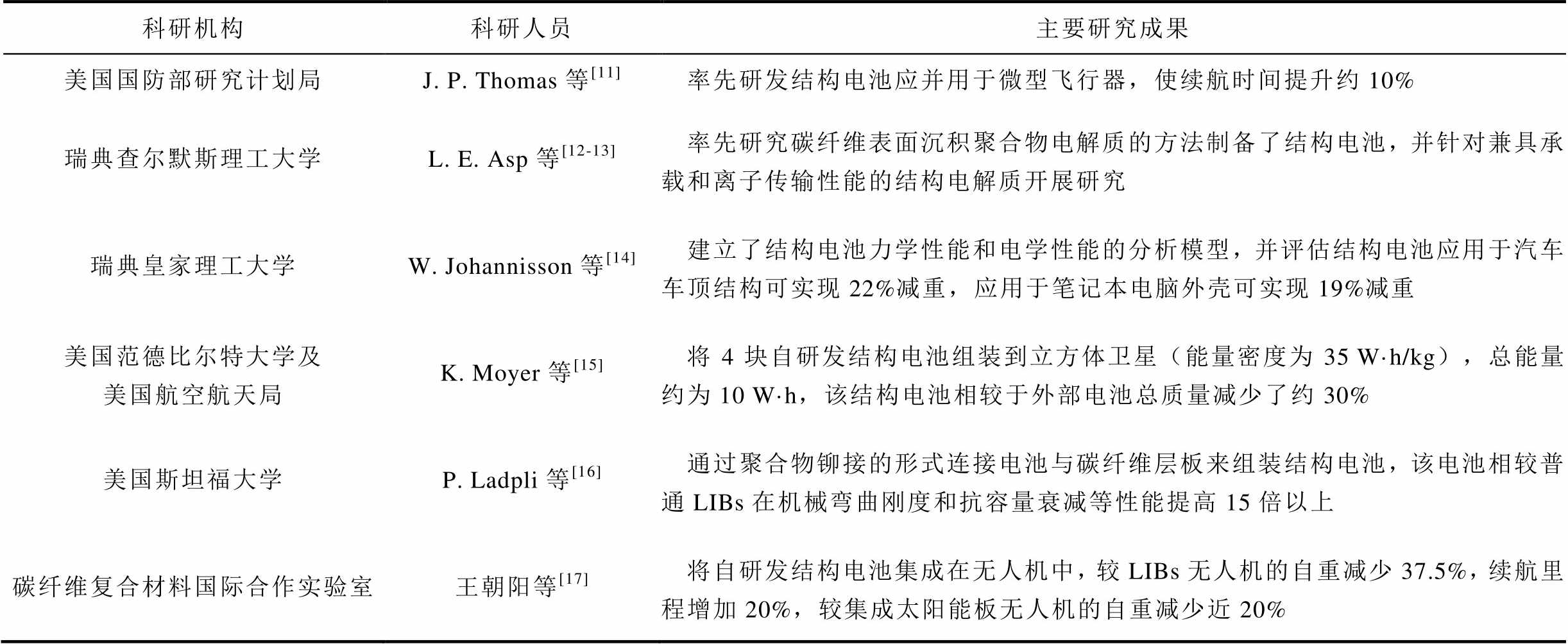 科研机构科研人员主要研究成果 美国国防部研究计划局J. P. Thomas等[11]率先研发结构电池应并用于微型飞行器,使续航时间提升约10% 瑞典查尔默斯理工大学L. E. Asp等[12-13]率先研究碳纤维表面沉积聚合物电解质的方法制备了结构电池,并针对兼具承载和离子传输性能的结构电解质开展研究 瑞典皇家理工大学W. Johannisson等[14]建立了结构电池力学性能和电学性能的分析模型,并评估结构电池应用于汽车车顶结构可实现22%减重,应用于笔记本电脑外壳可实现19%减重 美国范德比尔特大学及美国航空航天局K. Moyer等[15]将4块自研发结构电池组装到立方体卫星(能量密度为35 W·h/kg),总能量约为10 W·h,该结构电池相较于外部电池总质量减少了约30% 美国斯坦福大学P. Ladpli等[16]通过聚合物铆接的形式连接电池与碳纤维层板来组装结构电池,该电池相较普通LIBs在机械弯曲刚度和抗容量衰减等性能提高15倍以上 碳纤维复合材料国际合作实验室王朝阳等[17]将自研发结构电池集成在无人机中,较LIBs无人机的自重减少37.5%,续航里程增加20%,较集成太阳能板无人机的自重减少近20%