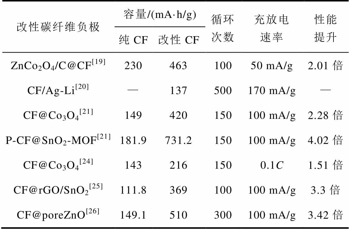 改性碳纤维负极容量/(mA·h/g)循环次数充放电速率性能提升 纯CF改性CF ZnCo2O4/C@CF[19]23046310050 mA/g2.01倍 CF/Ag-Li[20]—137500170 mA/g— CF@Co3O4[21]149420150100 mA/g2.28倍 P-CF@SnO2-MOF[21]181.9731.2150100 mA/g4.02倍 CF@Co3O4[24]1432161500.1C1.51倍 CF@rGO/SnO2[25]111.8369100100 mA/g3.3倍 CF@poreZnO[26]149.1510300100 mA/g3.42倍
