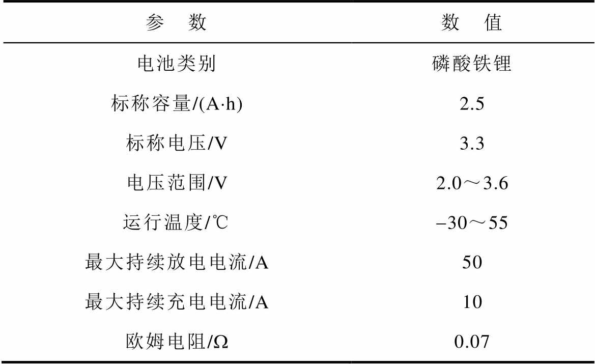 参 数数 值 电池类别磷酸铁锂 标称容量/(A×h)2.5 标称电压/V3.3 电压范围/V2.0~3.6 运行温度/℃-30~55 最大持续放电电流/A50 最大持续充电电流/A10 欧姆电阻/W0.07