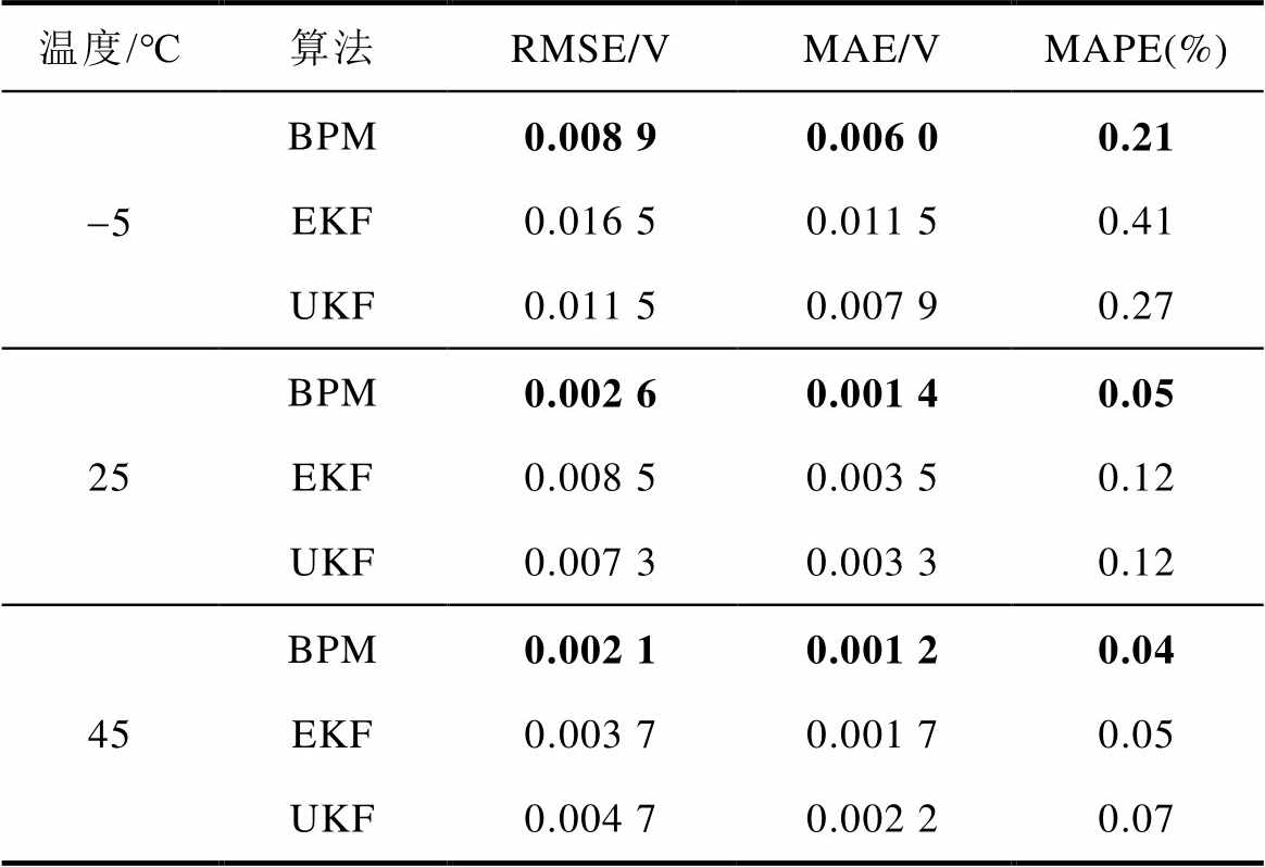 进一步地,使用模型估计电压作为模型精度的评估标准,见表4。实验结果显示,BPM算法使电池模型精度上有了大幅提高。在25℃效果最为突出,相较于EKF、UKF分别提高了约36%、61%。对比三种环境下的结果,可以看出低温环境对电池模型精度影响较大,高温对于电池模型精度影响较小。