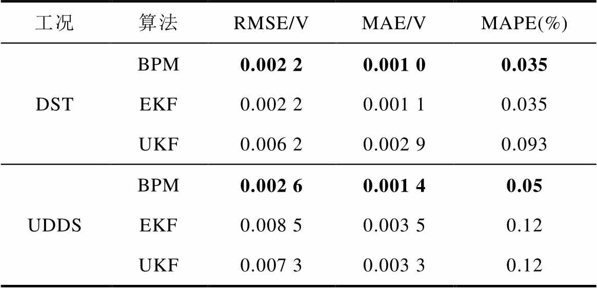 表5为不同工况下电池模型的电压估计精度指标。相较于UDDS工况,DST工况下三种算法的精度均得到了提高。DST工况下的BPM算法与EKF算法的进度相当,高于UKF算法。从图11g中的SOC误差曲线可以看出,UKF算法SOC估计的结果较不稳定,BPM与EKF算法的SOC估计结果基本相同。