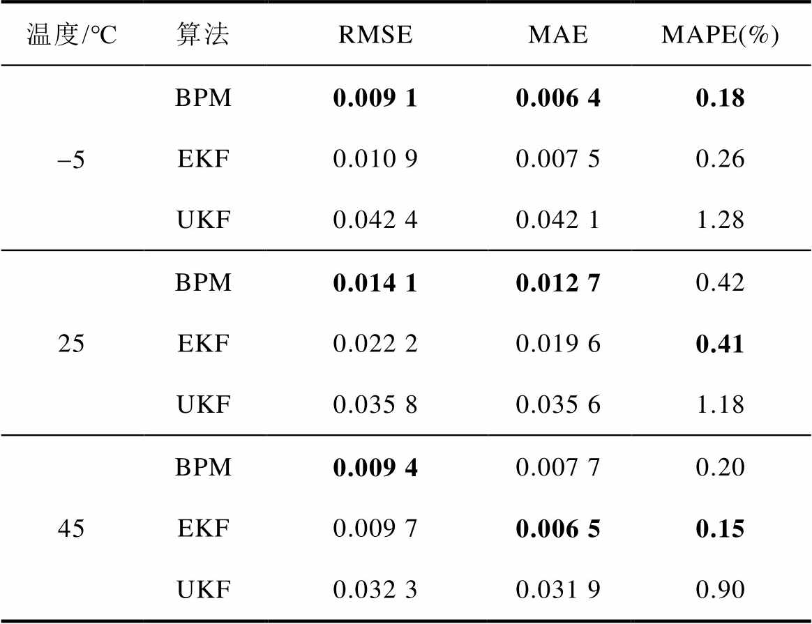 温度/℃算法RMSEMAEMAPE(%) -5BPM0.009 10.006 40.18 EKF0.010 90.007 50.26 UKF0.042 40.042 11.28 25BPM0.014 10.012 70.42 EKF0.022 20.019 60.41 UKF0.035 80.035 61.18 45BPM0.009 40.007 70.20 EKF0.009 70.006 50.15 UKF0.032 30.031 90.90