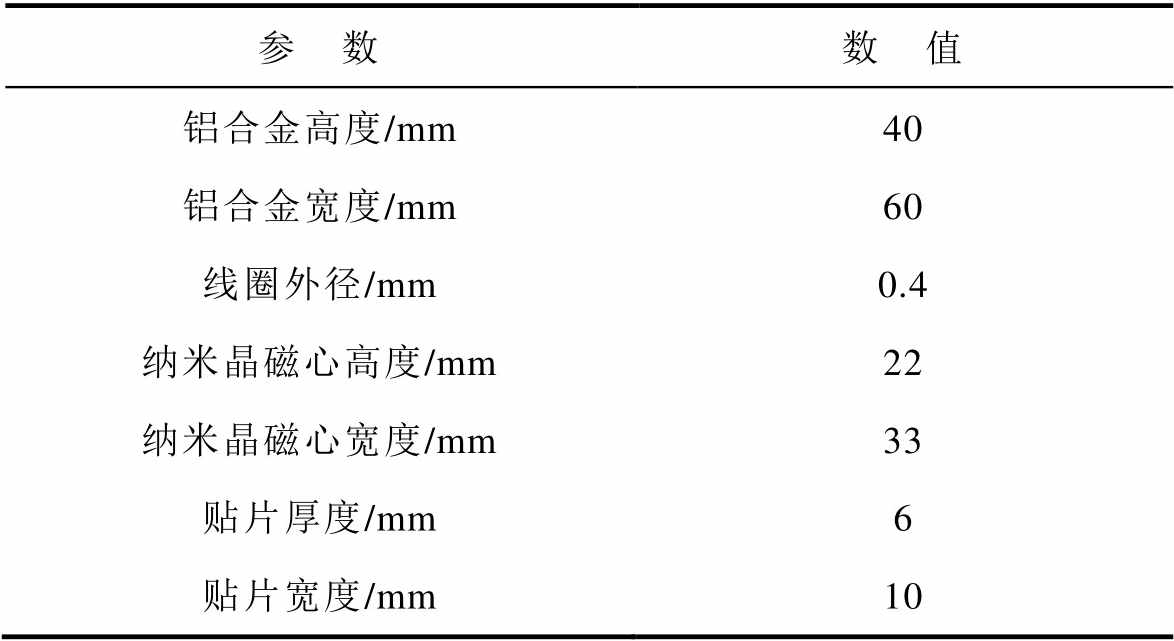 参 数数 值 铝合金高度/mm40 铝合金宽度/mm60 线圈外径/mm0.4 纳米晶磁心高度/mm22 纳米晶磁心宽度/mm33 贴片厚度/mm6 贴片宽度/mm10