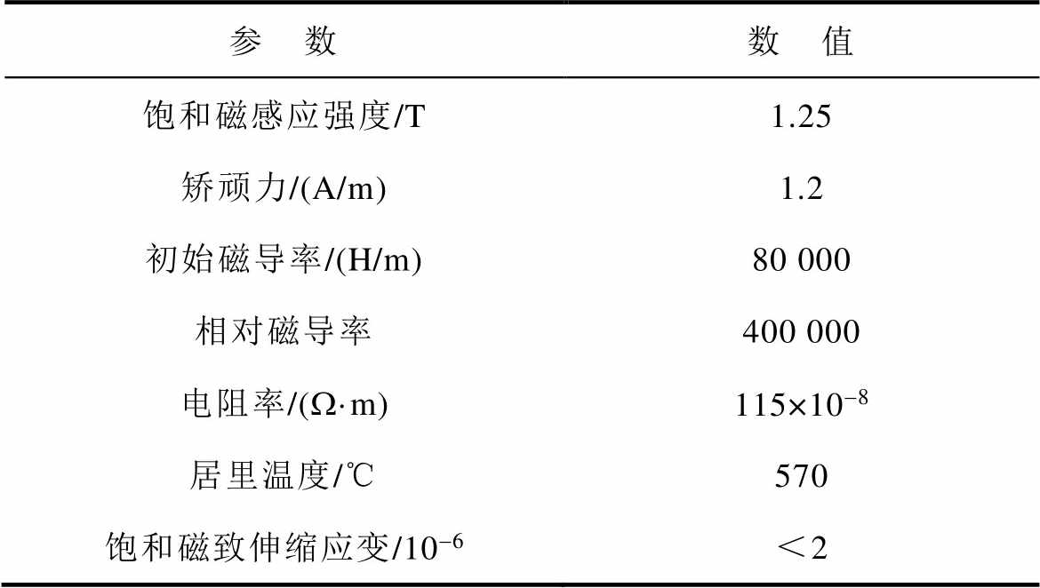 参 数数 值 饱和磁感应强度/T1.25 矫顽力/(A/m)1.2 初始磁导率/(H/m)80 000 相对磁导率400 000 电阻率/(W·m)115×10-8 居里温度/℃570 饱和磁致伸缩应变/10-6<2