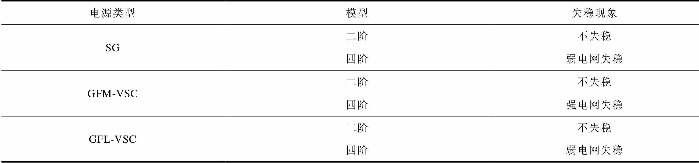 电源类型模型失稳现象 SG二阶不失稳 四阶弱电网失稳 GFM-VSC二阶不失稳 四阶强电网失稳 GFL-VSC二阶不失稳 四阶弱电网失稳