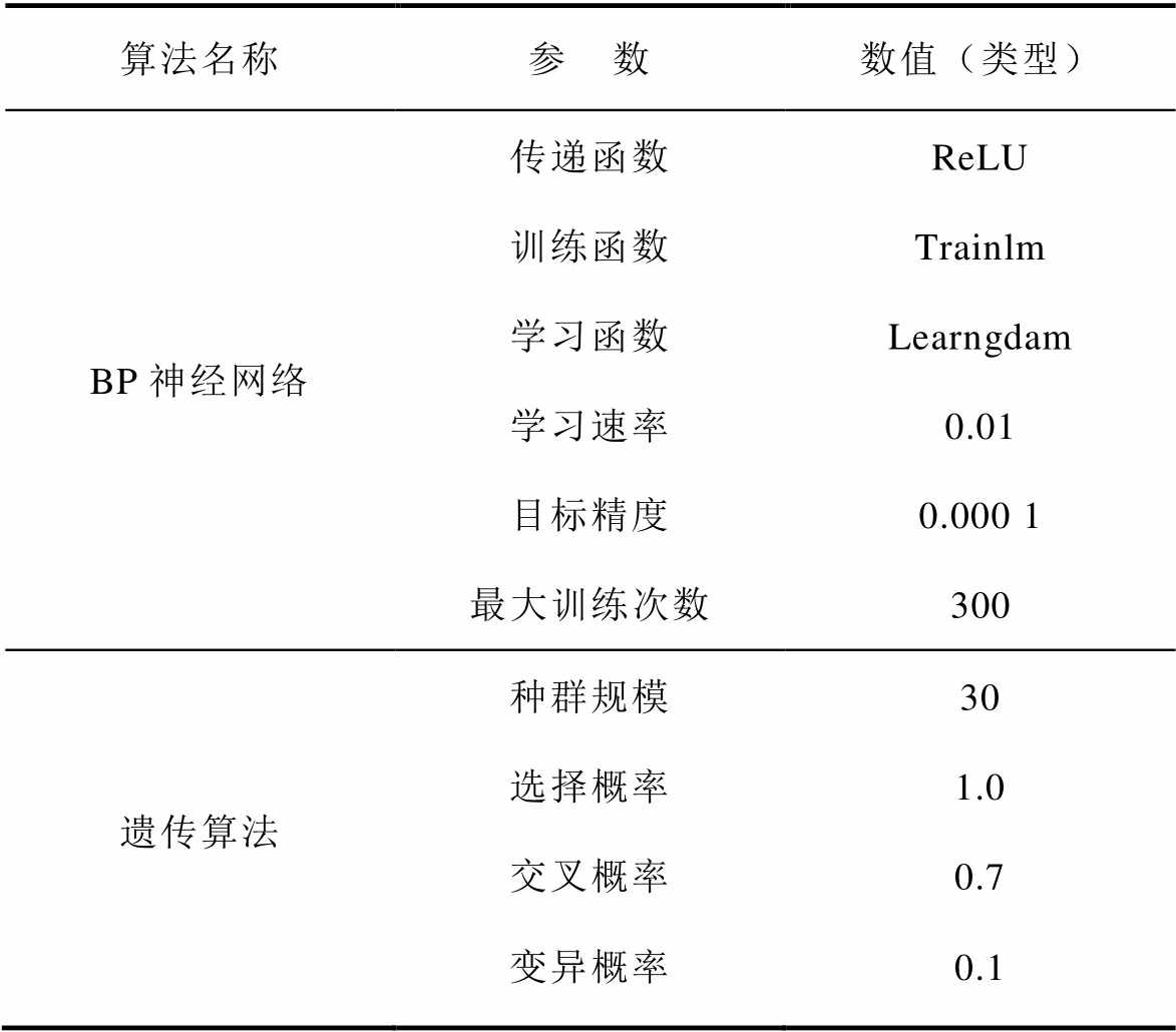 算法名称参 数数值(类型) BP神经网络传递函数ReLU 训练函数Trainlm 学习函数Learngdam 学习速率0.01 目标精度0.000 1 最大训练次数300 遗传算法种群规模30 选择概率1.0 交叉概率0.7 变异概率0.1
