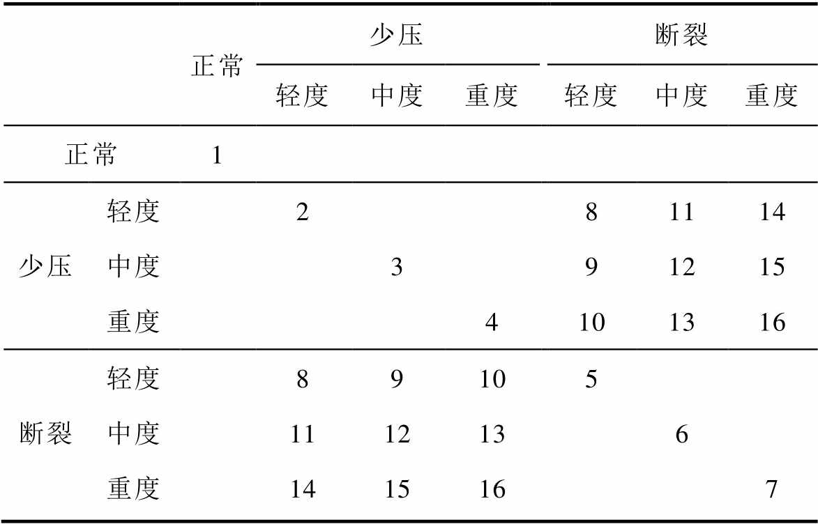 正常少压断裂 轻度中度重度轻度中度重度 正常1 少压轻度281114 中度391215 重度4101316 断裂轻度89105 中度1112136 重度1415167