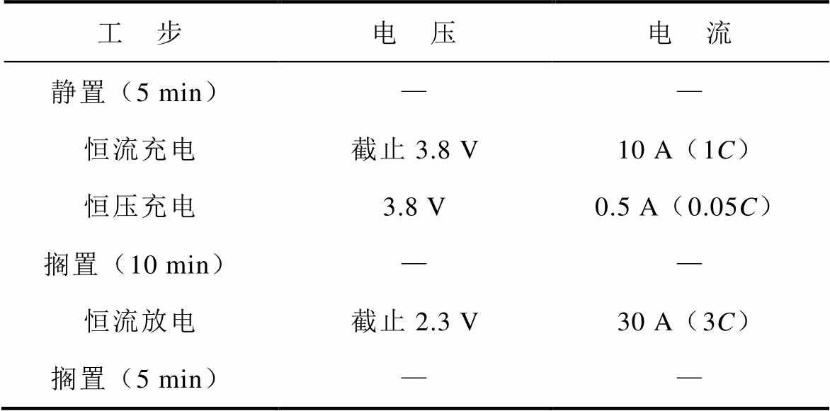 工 步电 压电 流 静置(5 min)—— 恒流充电截止3.8 V10 A(1C) 恒压充电3.8 V0.5 A(0.05C) 搁置(10 min)—— 恒流放电截止2.3 V30 A(3C) 搁置(5 min)——