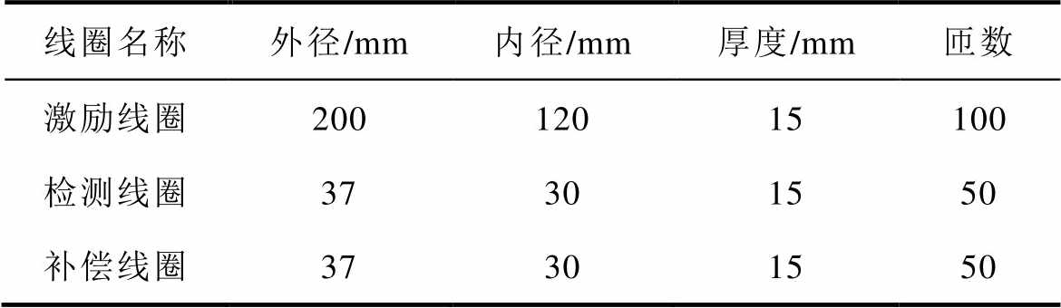 线圈名称外径/mm内径/mm厚度/mm匝数 激励线圈20012015100 检测线圈37301550 补偿线圈37301550