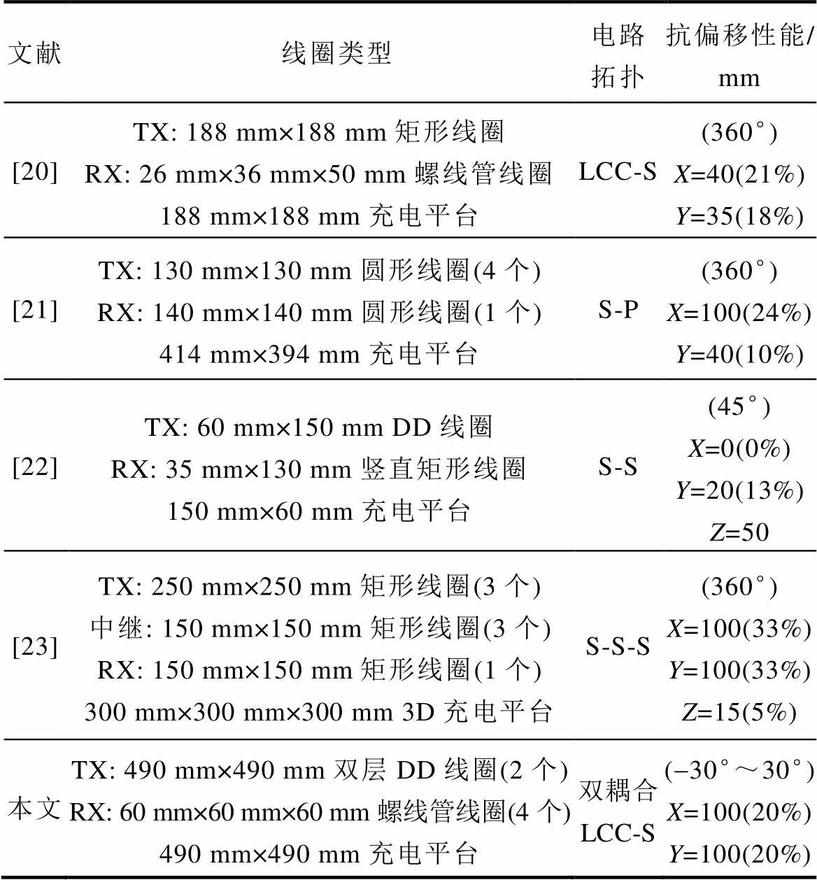 文献线圈类型电路拓扑抗偏移性能/ mm [20]TX: 188 mm×188 mm矩形线圈RX: 26 mm×36 mm×50 mm螺线管线圈188 mm×188 mm充电平台LCC-S(360°)X=40(21%)Y=35(18%) [21]TX: 130 mm×130 mm圆形线圈(4个)RX: 140 mm×140 mm圆形线圈(1个)414 mm×394 mm充电平台S-P(360°)X=100(24%)Y=40(10%) [22]TX: 60 mm×150 mm DD线圈RX: 35 mm×130 mm竖直矩形线圈150 mm×60 mm充电平台S-S(45°)X=0(0%)Y=20(13%)Z=50 [23]TX: 250 mm×250 mm矩形线圈(3个)中继: 150 mm×150 mm矩形线圈(3个)RX: 150 mm×150 mm矩形线圈(1个)300 mm×300 mm×300 mm 3D充电平台S-S-S(360°)X=100(33%)Y=100(33%)Z=15(5%) 本文TX: 490 mm×490 mm双层DD线圈(2个)RX: 60 mm×60 mm×60 mm螺线管线圈(4个)490 mm×490 mm充电平台双耦合LCC-S(-30°~30°)X=100(20%)Y=100(20%)