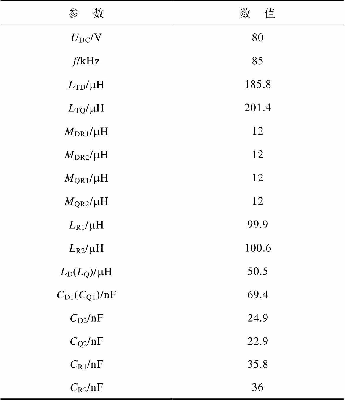 参 数数 值 UDC/V80 f/kHz85 LTD/mH185.8 LTQ/mH201.4 MDR1/mH12 MDR2/mH12 MQR1/mH12 MQR2/mH12 LR1/mH99.9 LR2/mH100.6 LD(LQ)/mH50.5 CD1(CQ1)/nF69.4 CD2/nF24.9 CQ2/nF22.9 CR1/nF35.8 CR2/nF36