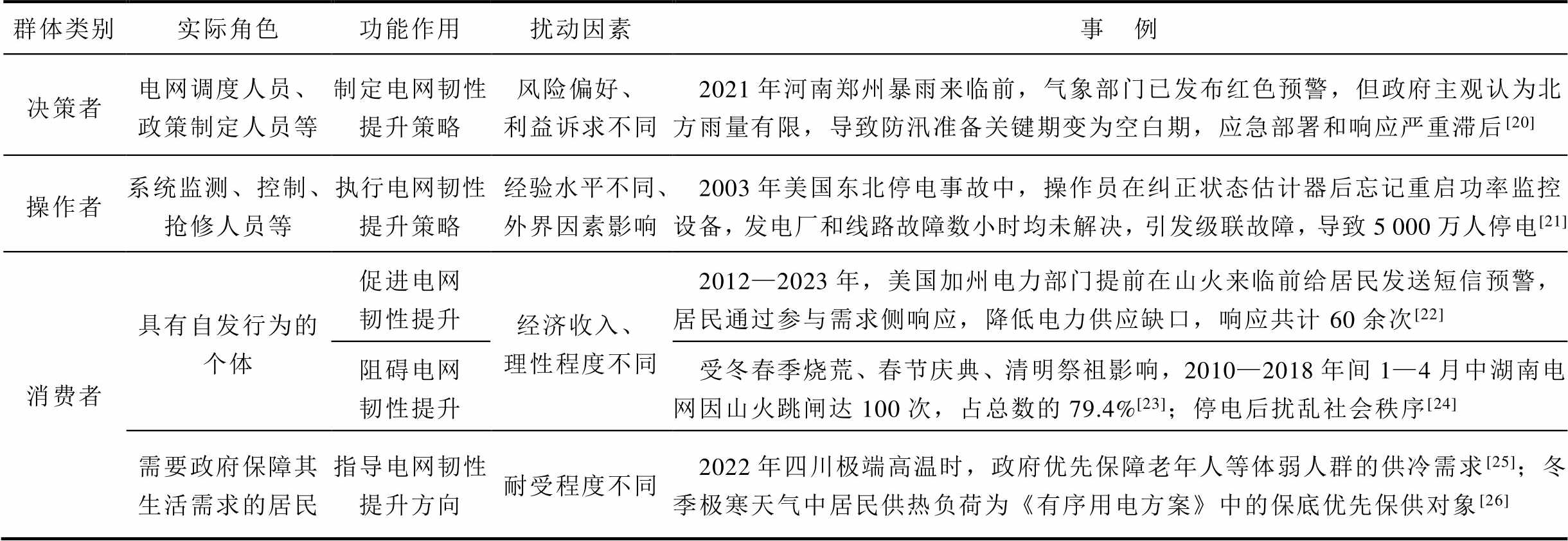 群体类别实际角色功能作用扰动因素事 例 决策者电网调度人员、政策制定人员等制定电网韧性提升策略风险偏好、利益诉求不同2021年河南郑州暴雨来临前,气象部门已发布红色预警,但政府主观认为北方雨量有限,导致防汛准备关键期变为空白期,应急部署和响应严重滞后[20] 操作者系统监测、控制、抢修人员等执行电网韧性提升策略 经验水平不同、外界因素影响2003年美国东北停电事故中,操作员在纠正状态估计器后忘记重启功率监控设备,发电厂和线路故障数小时均未解决,引发级联故障,导致5 000万人停电[21] 消费者具有自发行为的个体促进电网韧性提升经济收入、理性程度不同2012—2023年,美国加州电力部门提前在山火来临前给居民发送短信预警,居民通过参与需求侧响应,降低电力供应缺口,响应共计60余次[22] 阻碍电网韧性提升受冬春季烧荒、春节庆典、清明祭祖影响,2010—2018年间1—4月中湖南电网因山火跳闸达100次,占总数的79.4%[23];停电后扰乱社会秩序[24] 需要政府保障其生活需求的居民指导电网韧性提升方向耐受程度不同2022年四川极端高温时,政府优先保障老年人等体弱人群的供冷需求[25];冬季极寒天气中居民供热负荷为《有序用电方案》中的保底优先保供对象[26]