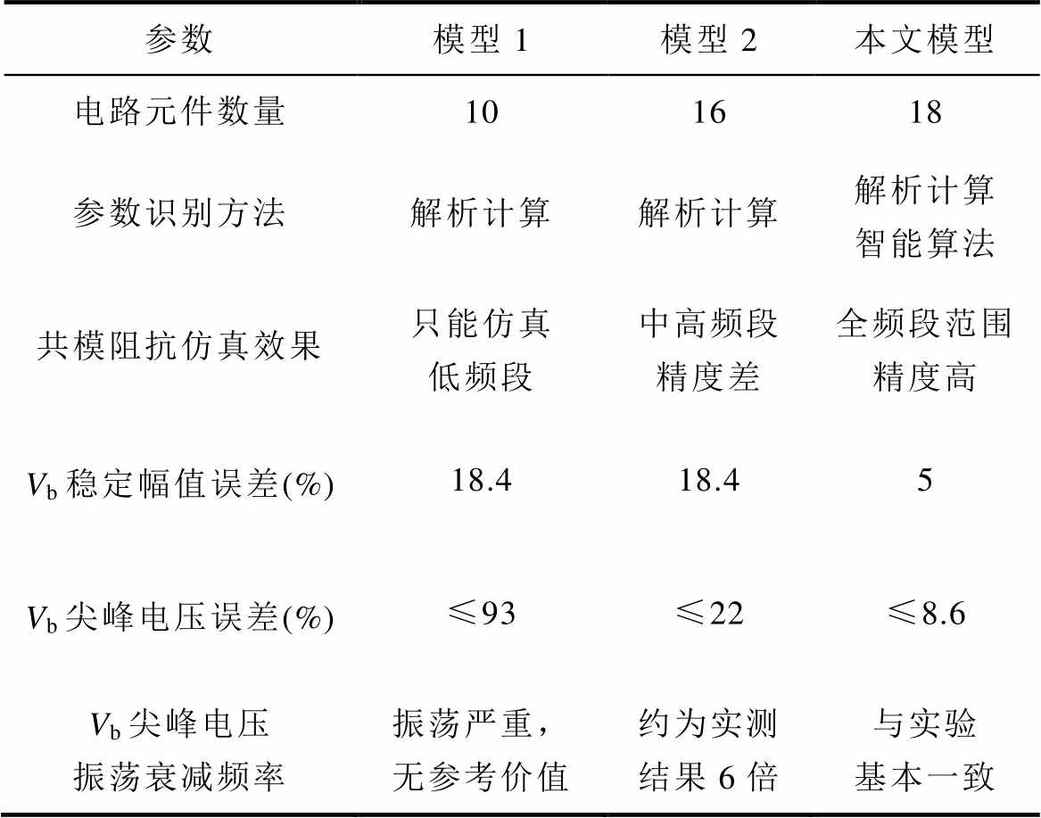 参数模型1模型2本文模型 电路元件数量101618 参数识别方法解析计算解析计算解析计算智能算法 共模阻抗仿真效果只能仿真低频段中高频段精度差全频段范围精度高 Vb稳定幅值误差(%)18.418.45 Vb尖峰电压误差(%)≤93≤22≤8.6 Vb尖峰电压振荡衰减频率振荡严重,无参考价值约为实测结果6倍与实验基本一致