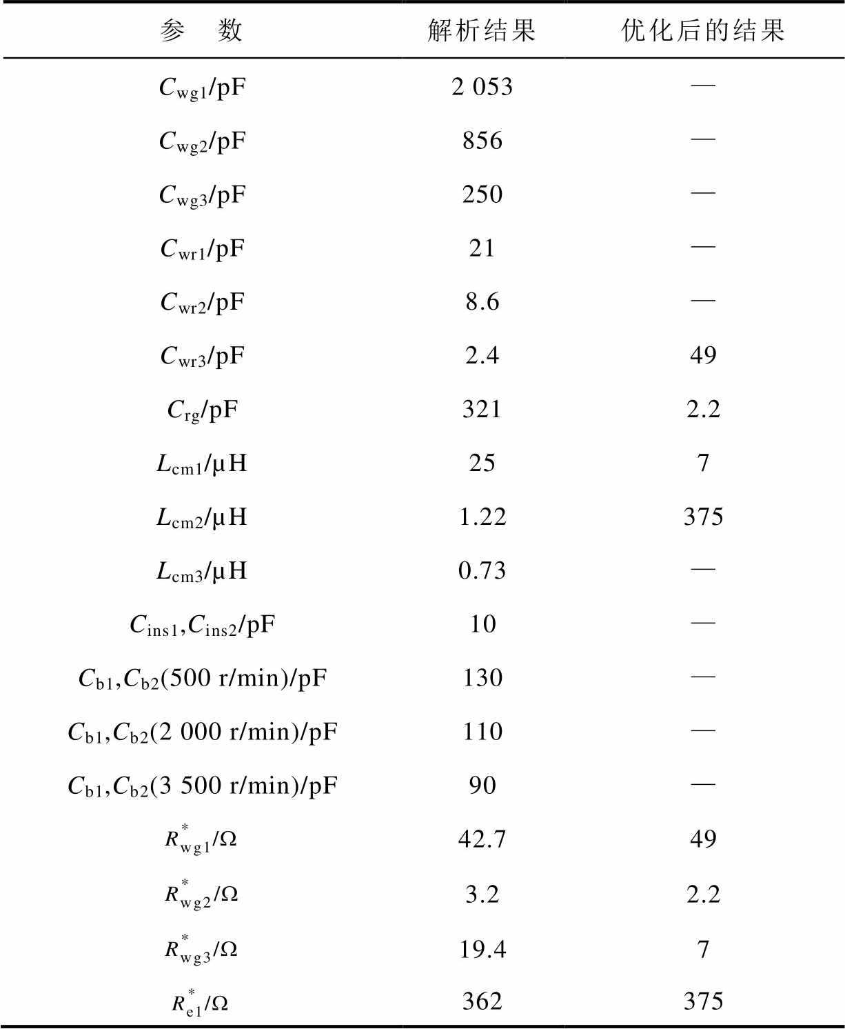 参 数解析结果优化后的结果 Cwg1/pF2 053— Cwg2/pF856— Cwg3/pF250— Cwr1/pF21— Cwr2/pF8.6— Cwr3/pF2.449 Crg/pF3212.2 Lcm1/µH257 Lcm2/µH1.22375 Lcm3/µH0.73— Cins1,Cins2/pF10— Cb1,Cb2(500 r/min)/pF130— Cb1,Cb2(2 000 r/min)/pF110— Cb1,Cb2(3 500 r/min)/pF90— 42.749 3.22.2 19.47 362375