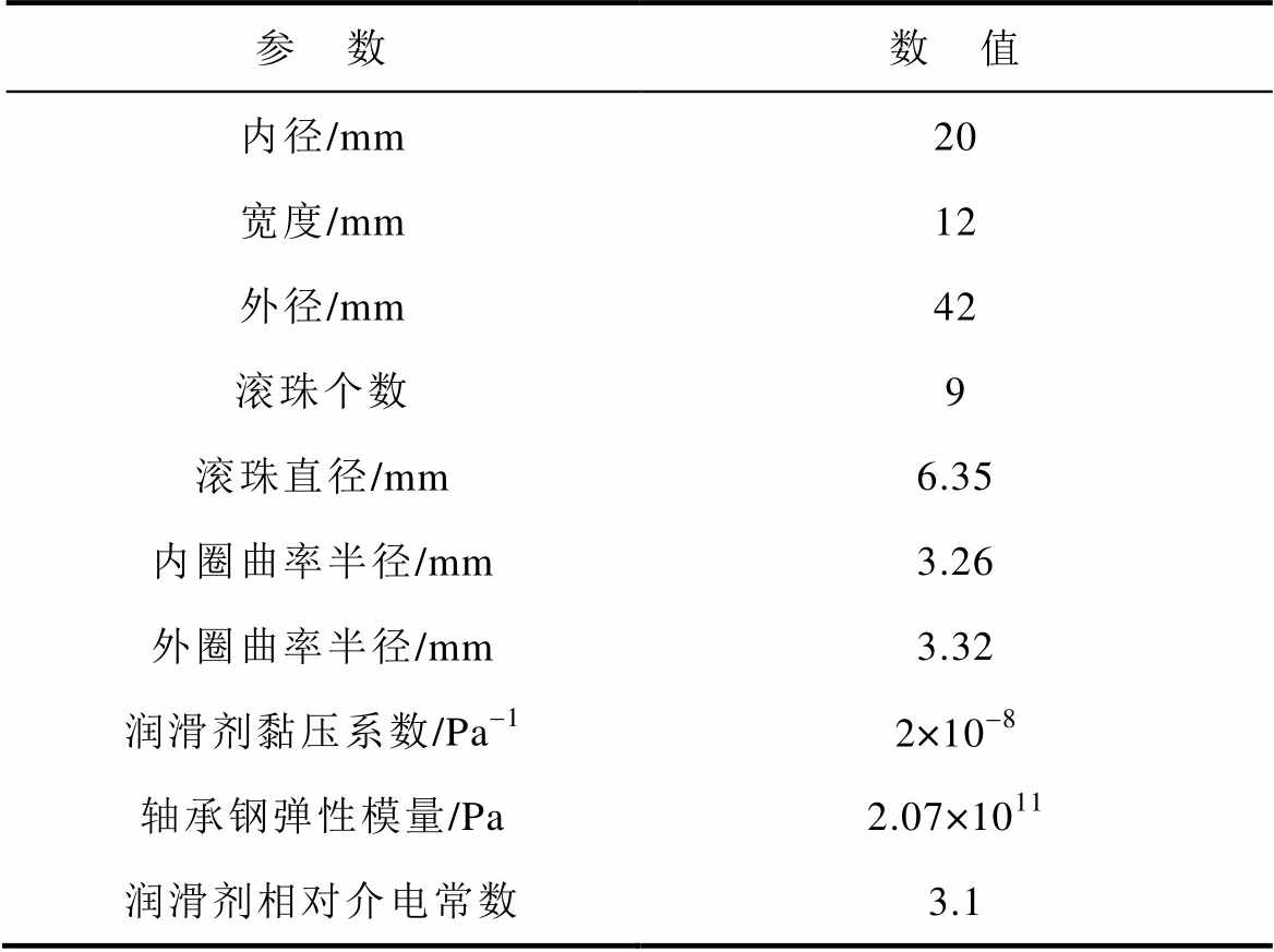 为平均线速度;E0为当量弹性模量;Rx为沿滚动方向的当量曲率半径;Qmax为滚动体所受最大载荷;K为接触区椭圆长轴与短轴比值。