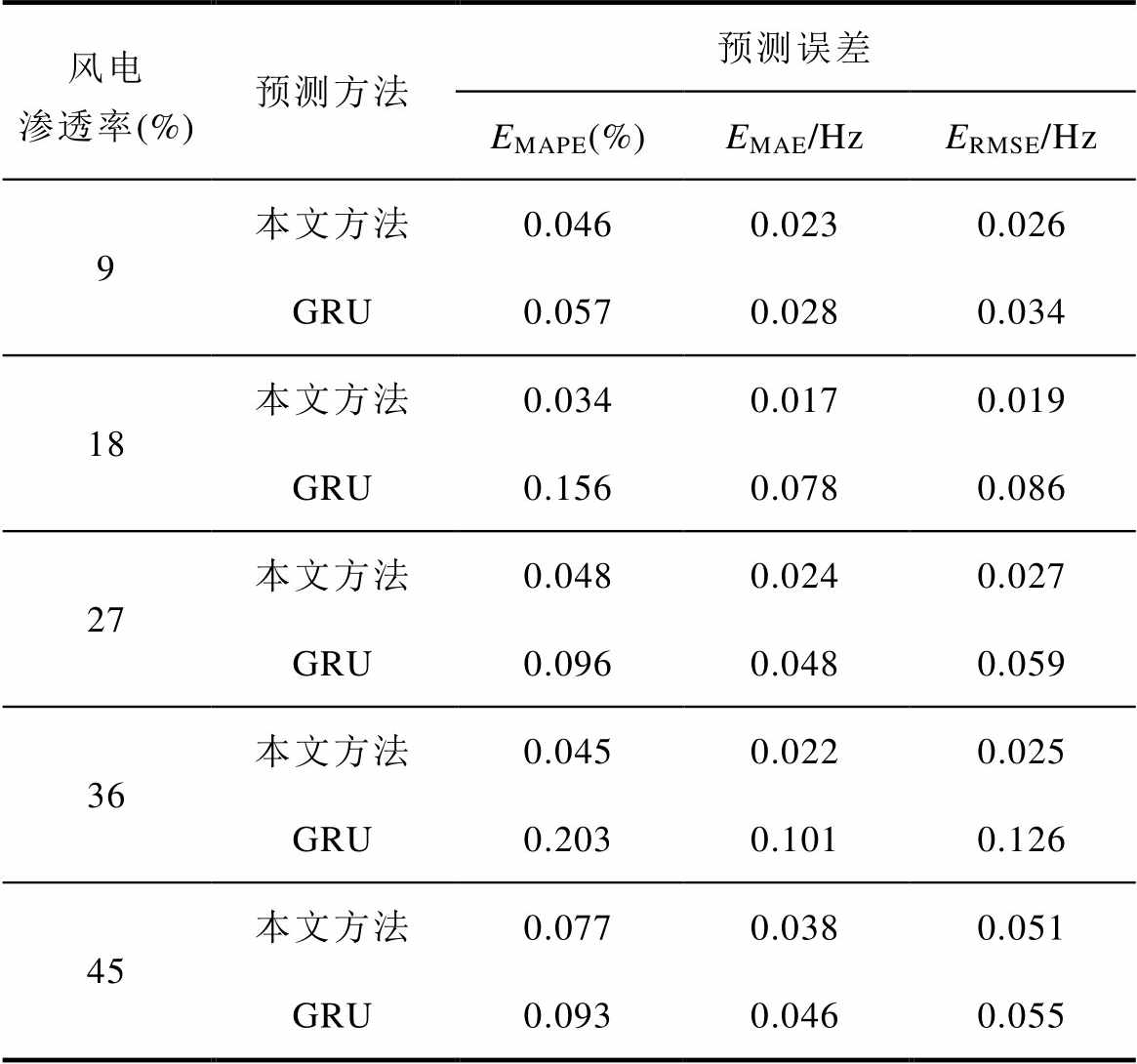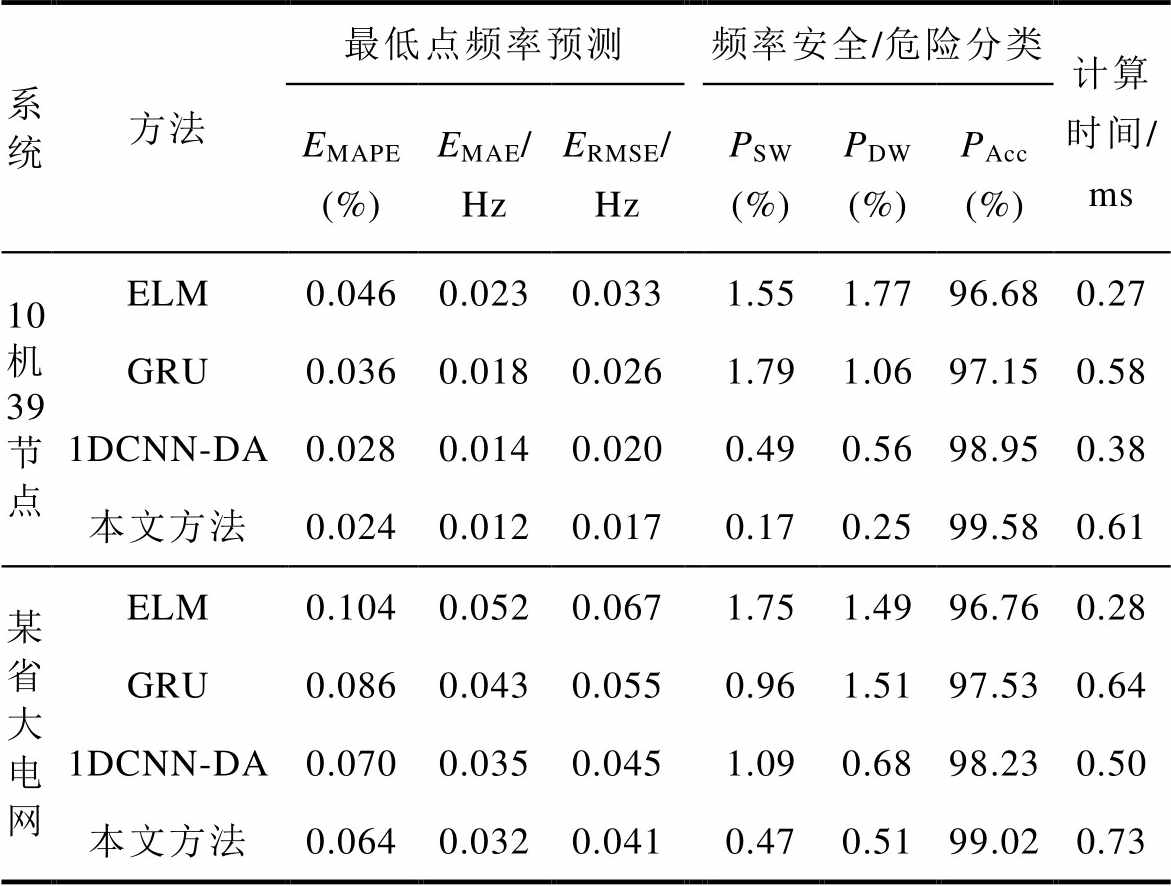 分别为49.41 Hz和49.77 Hz。对于主动低频减载方法,使用测量窗口长度为0.2 s的系统暂态数据进行频率最低点预测。