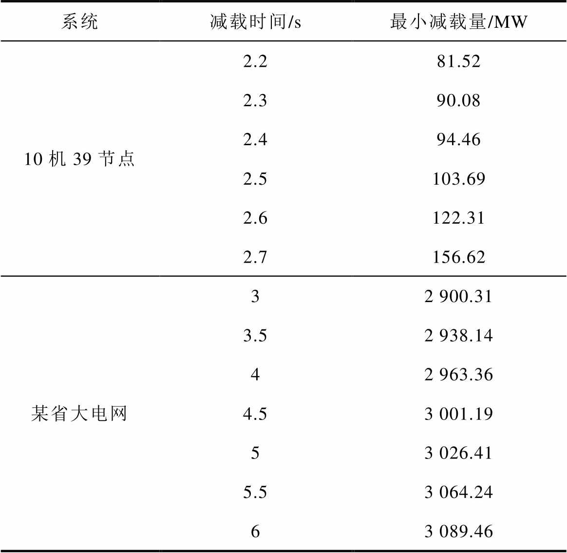 系统减载时间/s最小减载量/MW 10机39节点2.281.52 2.390.08 2.494.46 2.5103.69 2.6122.31 2.7156.62 某省大电网32 900.31 3.52 938.14 42 963.36 4.53 001.19 53 026.41 5.53 064.24 63 089.46