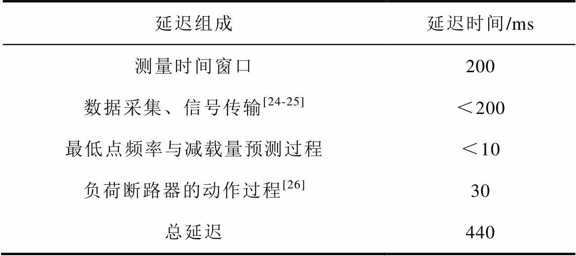 延迟组成延迟时间/ms 测量时间窗口200 数据采集、信号传输[24-25]<200 最低点频率与减载量预测过程<10 负荷断路器的动作过程[26]30 总延迟440
