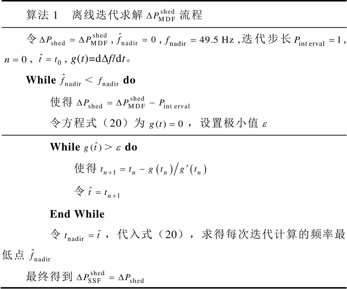 (2)主动低频减载量预测。离线阶段,基于设置的最低点频率约束