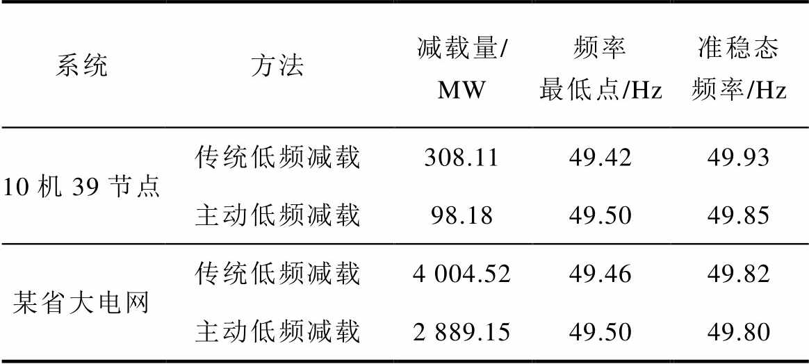 值分别为49.42 Hz和49.93 Hz,主动减载方法为49.50 Hz和49.85 Hz。对于某省大电网系统传统低频减载策略的