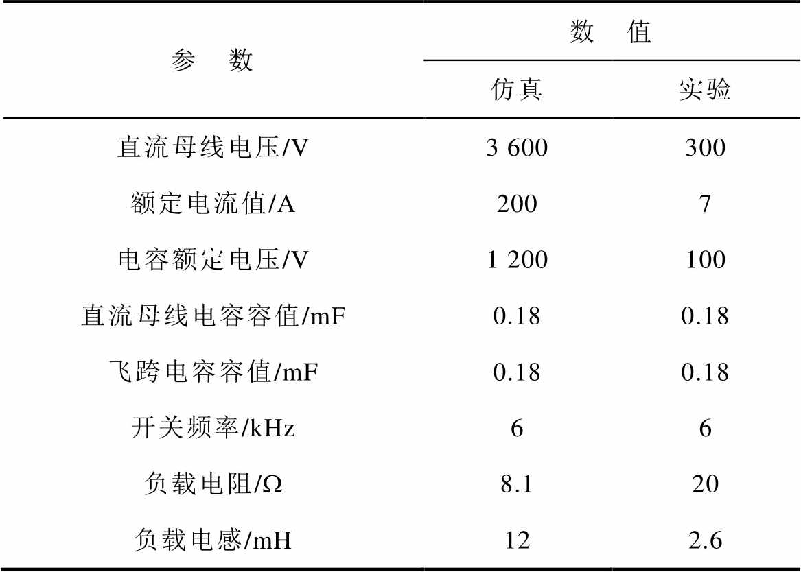 参 数数 值 仿真实验 直流母线电压/V3 600300 额定电流值/A2007 电容额定电压/V1 200100 直流母线电容容值/mF0.180.18 飞跨电容容值/mF0.180.18 开关频率/kHz66 负载电阻/W8.120 负载电感/mH122.6