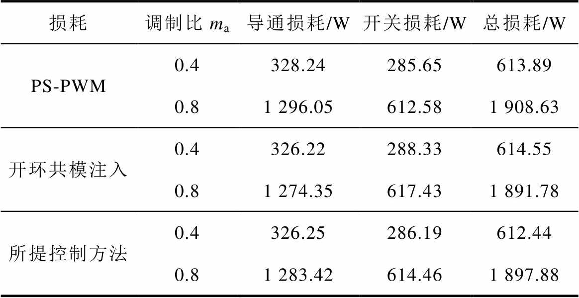 损耗调制比ma导通损耗/W开关损耗/W总损耗/W PS-PWM0.4328.24285.65613.89 0.81296.05612.581908.63 开环共模注入0.4326.22288.33614.55 0.81274.35617.431891.78 所提控制方法0.4326.25286.19612.44 0.81283.42614.461897.88