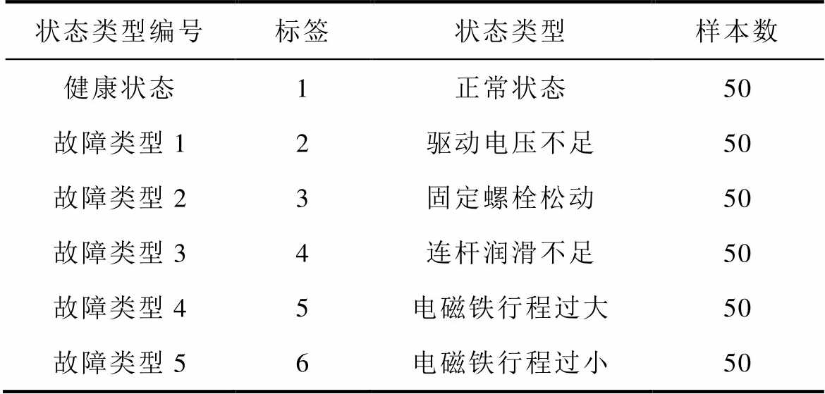 状态类型编号标签状态类型样本数 健康状态1正常状态50 故障类型12驱动电压不足50 故障类型23固定螺栓松动50 故障类型34连杆润滑不足50 故障类型45电磁铁行程过大50 故障类型56电磁铁行程过小50