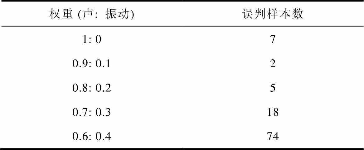 采集各状态类型的声振信号,分别提取声信号和振动信号对应的对数梅尔频谱图,并将其采用加权合并的方式,得到具有混合特征的对数梅尔频谱图。声信号可以同时反映机械动作与电磁噪声的耦合效应,在检测高频故障时表现优异,具有较强的鲁棒性;而振动信号对低频故障敏感,但其易受传感器安装位置的影响,底座振动可能会掩盖部分故障特征,所以,振动信号的权重应适当地降低,从而避免对混合特征提取的负面影响。为了找到更优的权重组合,在此设置了多组预实验来测试不同权重比对故障检测的影响,不同权重比对应的故障检测结果见表2。