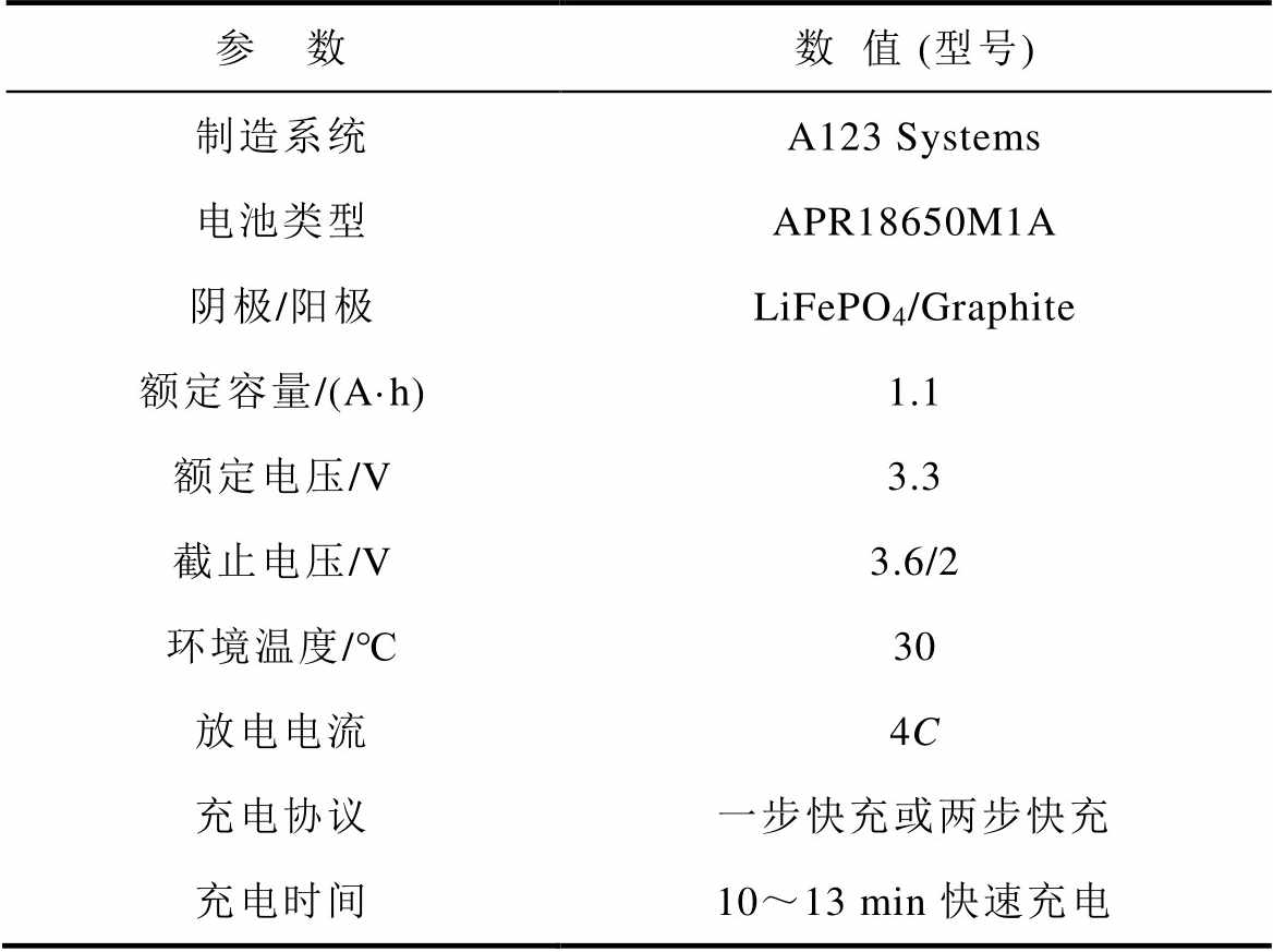 参 数数值 (型号) 制造系统A123 Systems 电池类型APR18650M1A 阴极/阳极LiFePO4/Graphite 额定容量/(A·h)1.1 额定电压/V3.3 截止电压/V3.6/2 环境温度/℃30 放电电流4C 充电协议一步快充或两步快充 充电时间10~13 min快速充电
