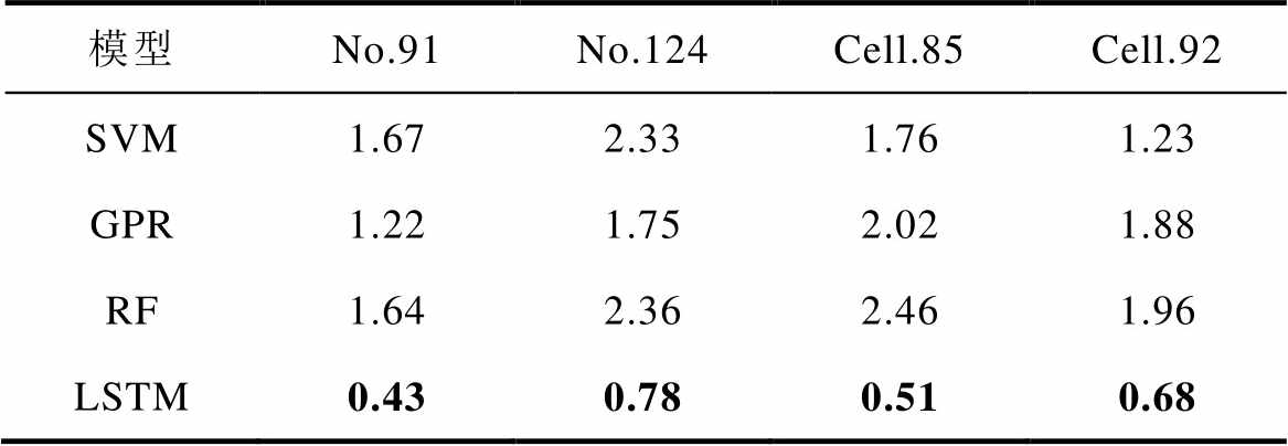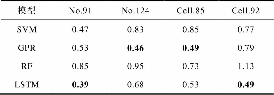 模型No.91No.124Cell.85Cell.92 SVM0.470.830.850.77 GPR0.530.460.490.79 RF0.850.950.731.13 LSTM0.390.680.530.49