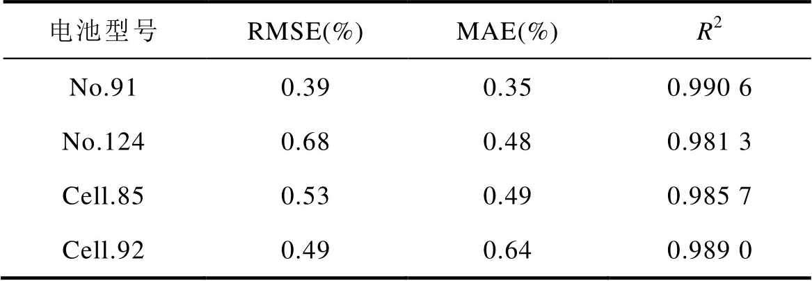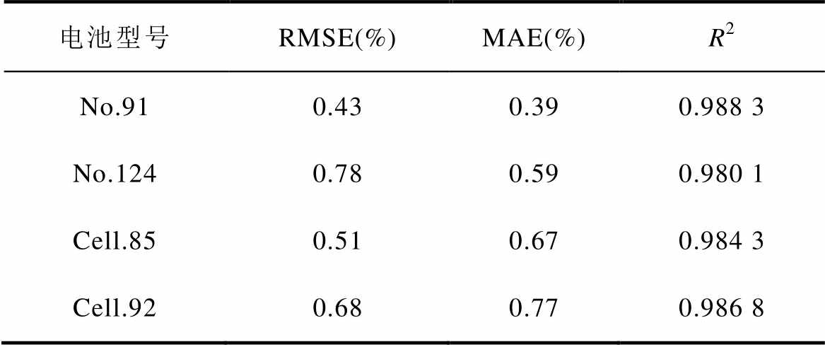 电池型号RMSE(%)MAE(%)R2 No.910.390.350.990 6 No.1240.680.480.981 3 Cell.850.530.490.985 7 Cell.920.490.640.989 0