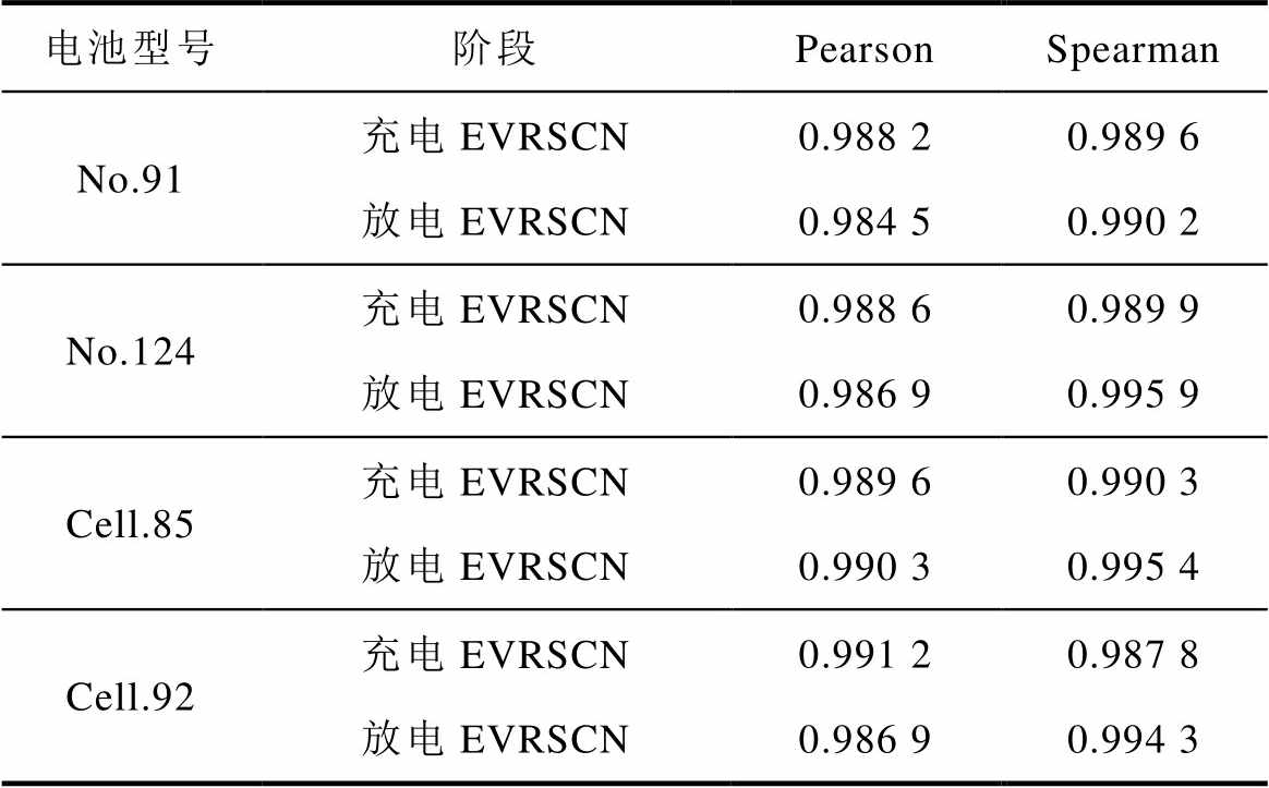 电池型号阶段PearsonSpearman No.91充电EVRSCN0.988 20.989 6 放电EVRSCN0.984 50.990 2 No.124充电EVRSCN0.988 60.989 9 放电EVRSCN0.986 90.995 9 Cell.85充电EVRSCN0.989 60.990 3 放电EVRSCN0.990 30.995 4 Cell.92充电EVRSCN0.991 20.987 8 放电EVRSCN0.986 90.994 3