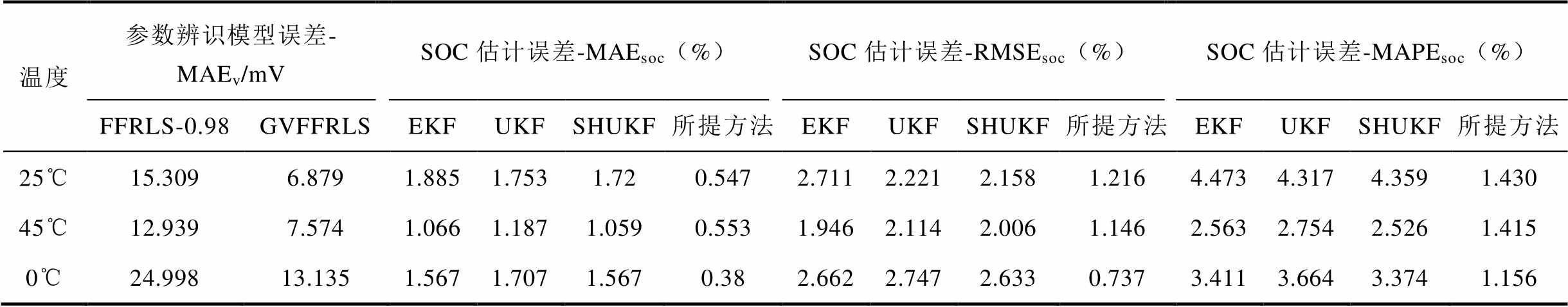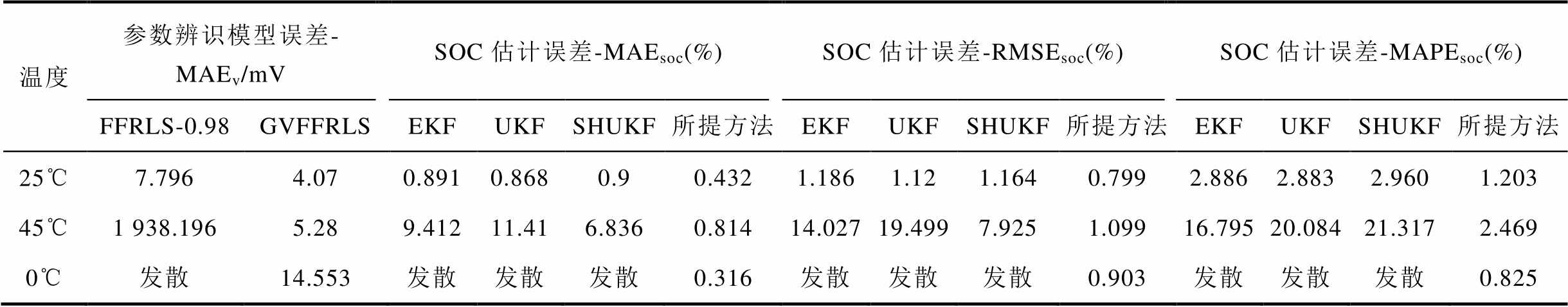 温度参数辨识模型误差MAEv/mVSOC估计误差-MAEsoc(%)SOC估计误差-RMSEsoc(%)SOC估计误差-MAPEsoc(%) FFRLS-0.98GVFFRLSEKFUKFSHUKF所提方法EKFUKFSHUKF所提方法EKFUKFSHUKF所提方法 25℃8.553.1641.5691.5681.5930.4932.0782.0772.1060.8313.2143.2123.2831.269 45℃31.098.9691.1861.0751.070.3081.862.052.0210.7632.8422.6032.6140.917 0℃20.50412.1021.6321.4981.4650.5182.0841.8491.8580.8164.0393.8243.7201.999